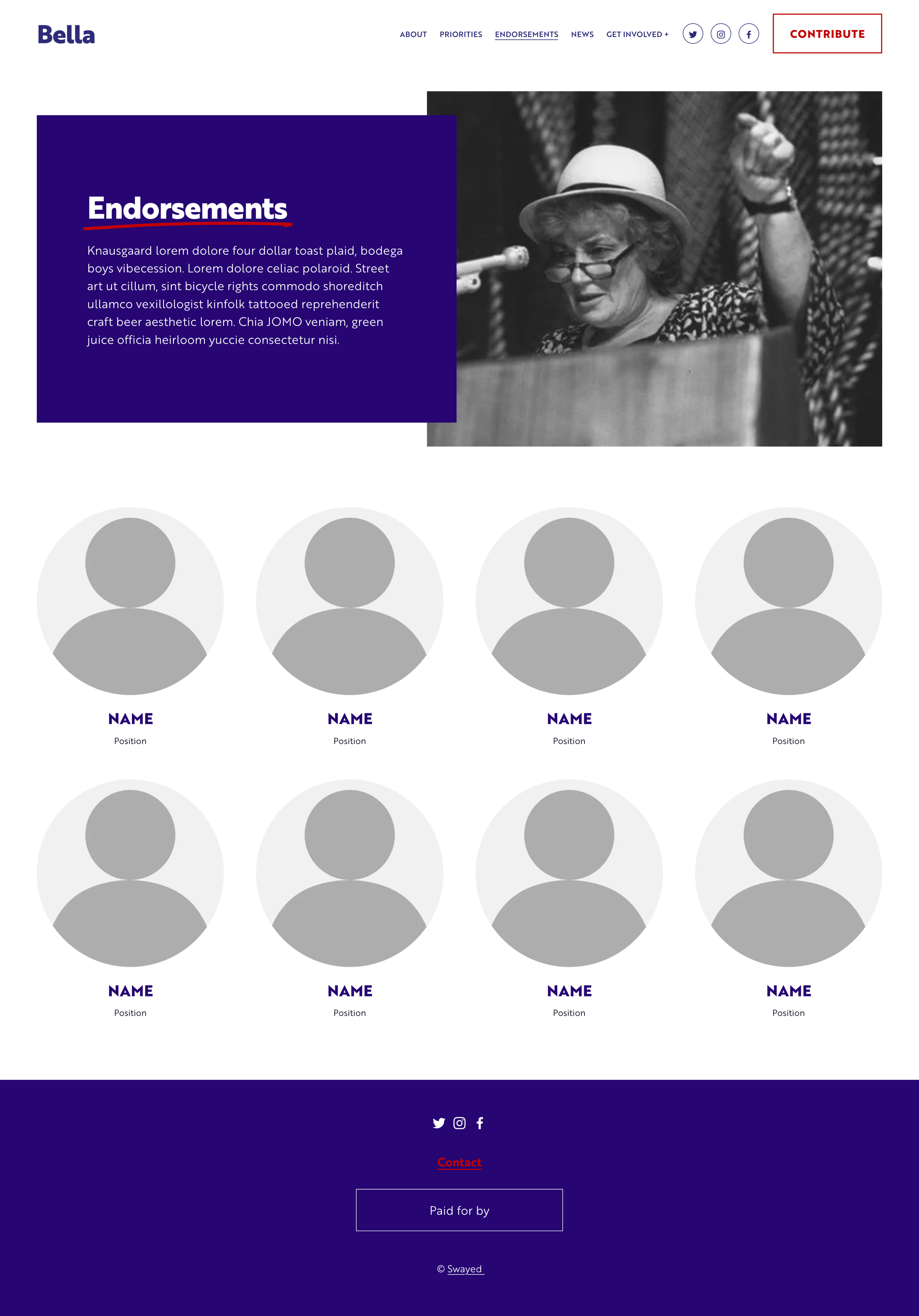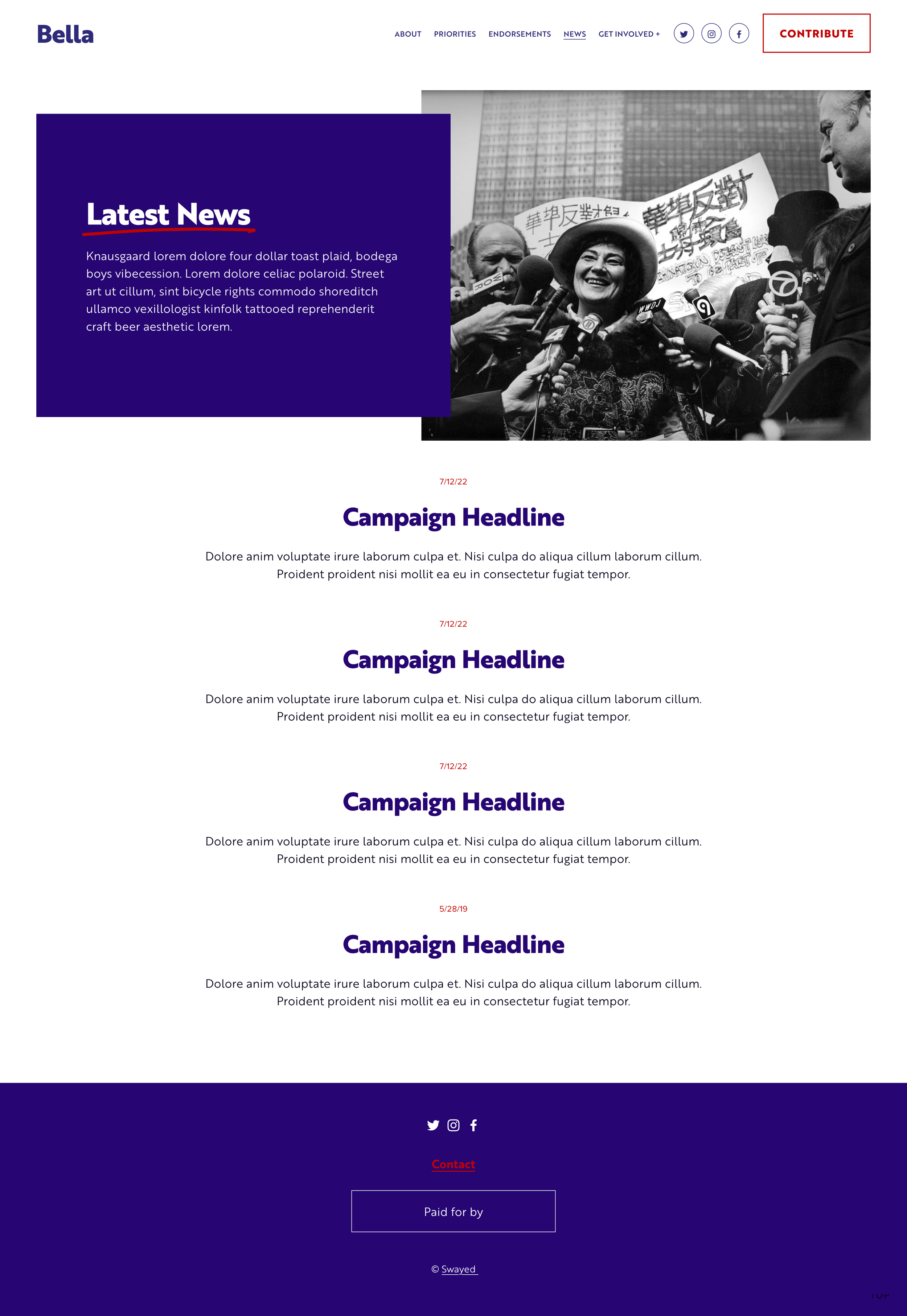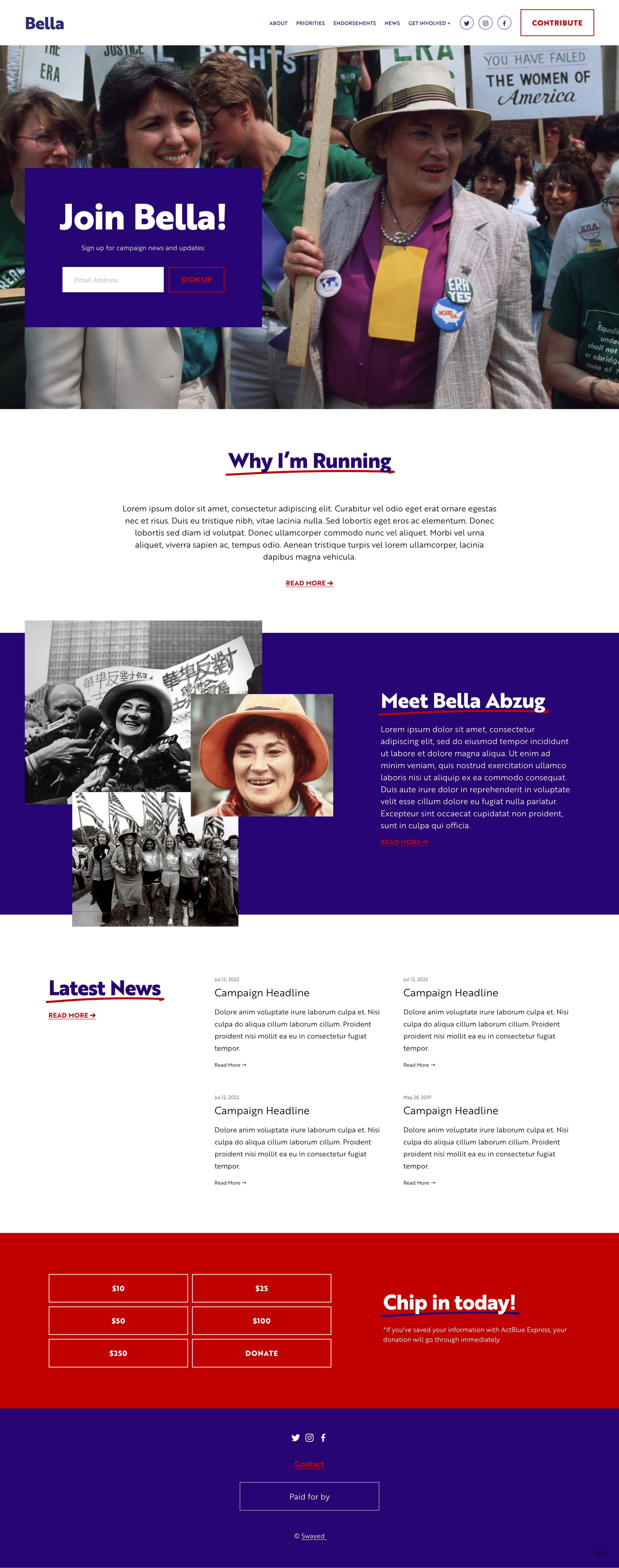 Like all our designs, “Bella” is super user-friendly, fully customizable, and a perfect fit for political campaigns of all sizes.