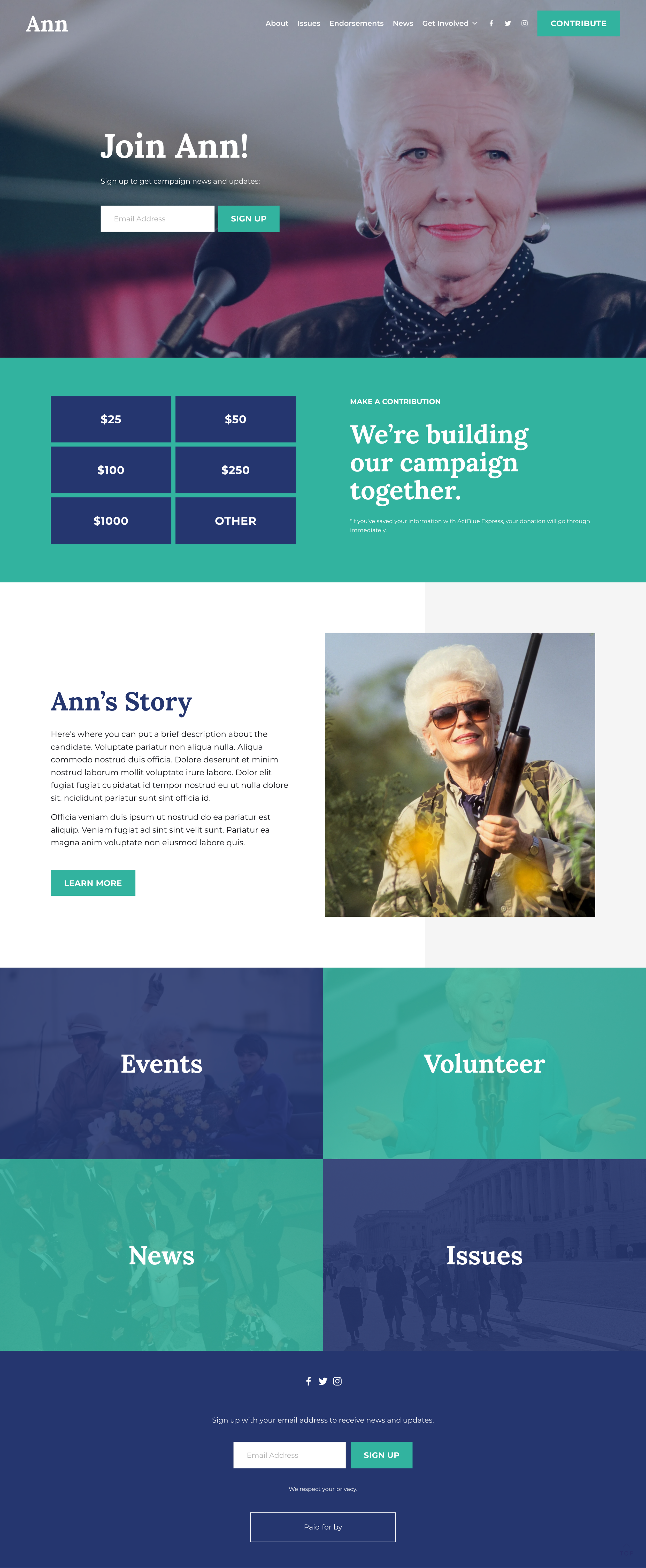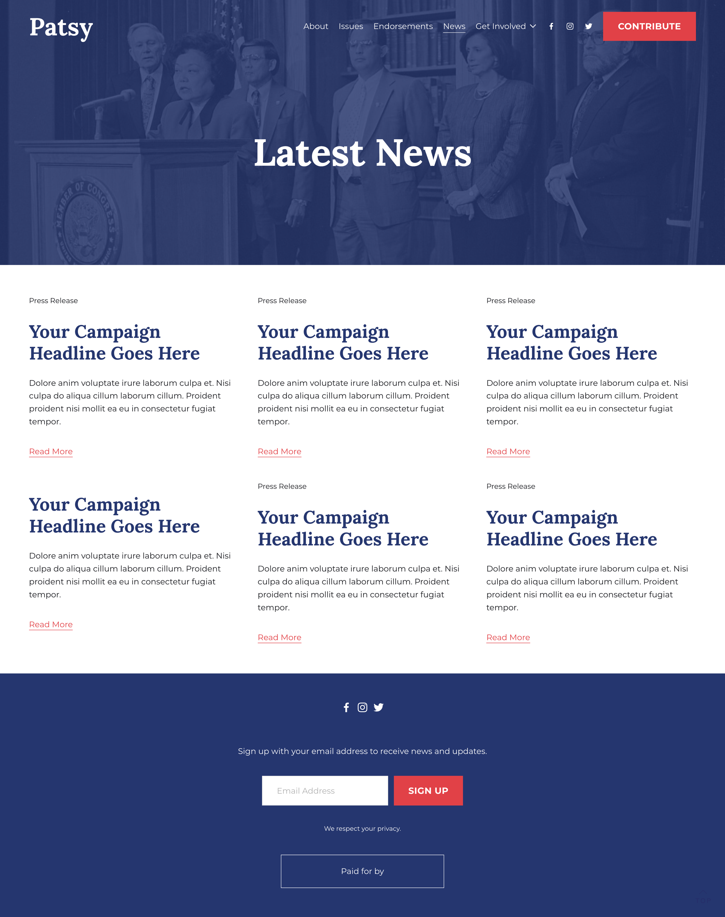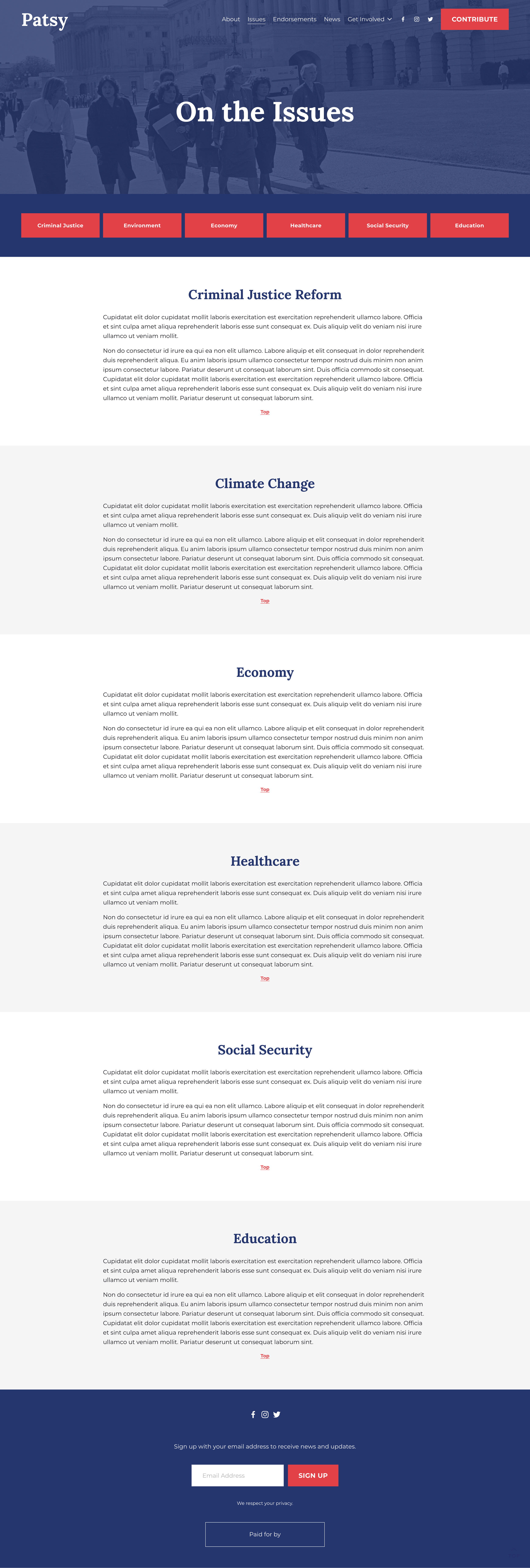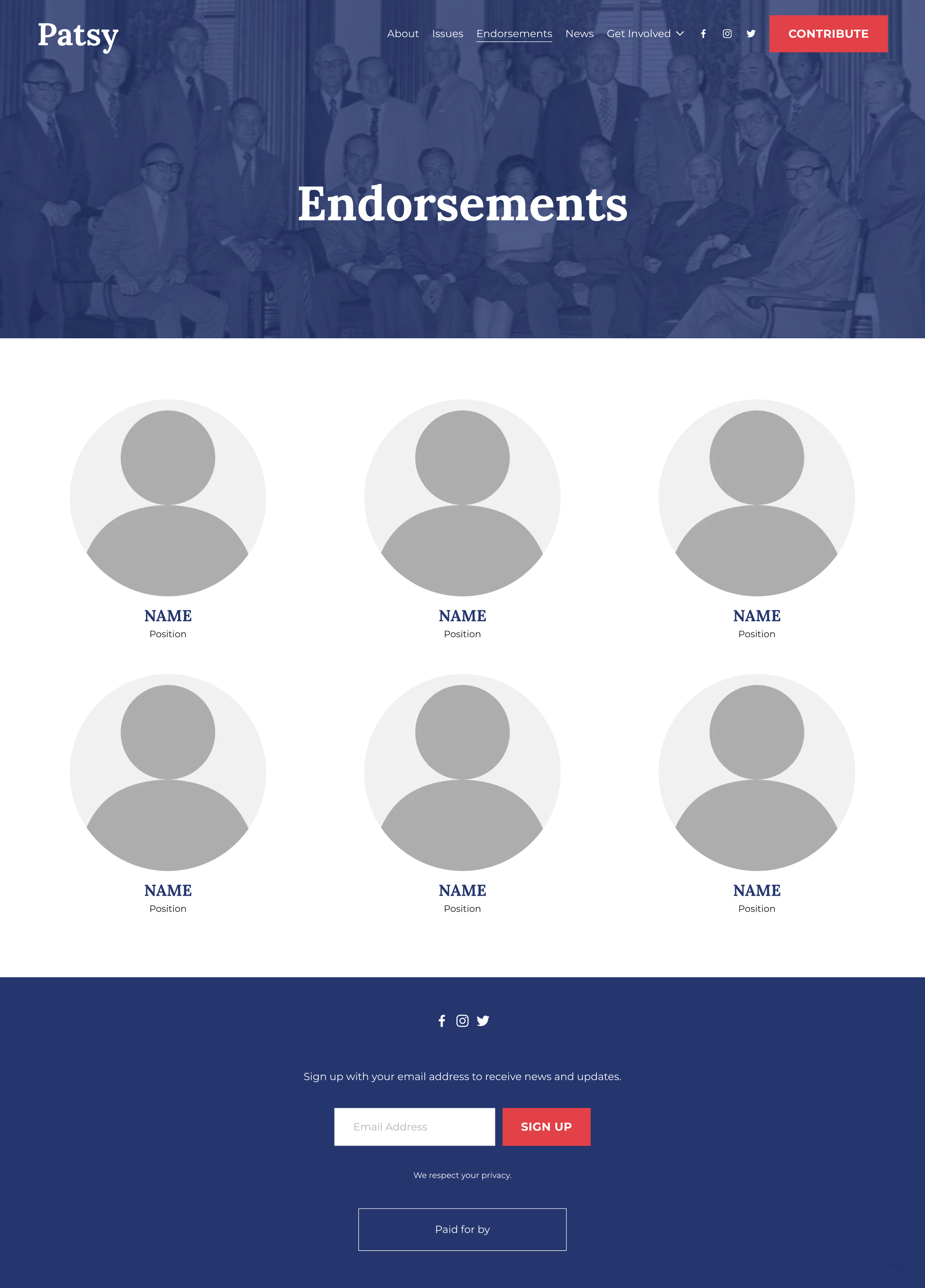 Like all our designs, Patsy is super easy to use, completely customizable, and perfect for political campaigns of all sizes.