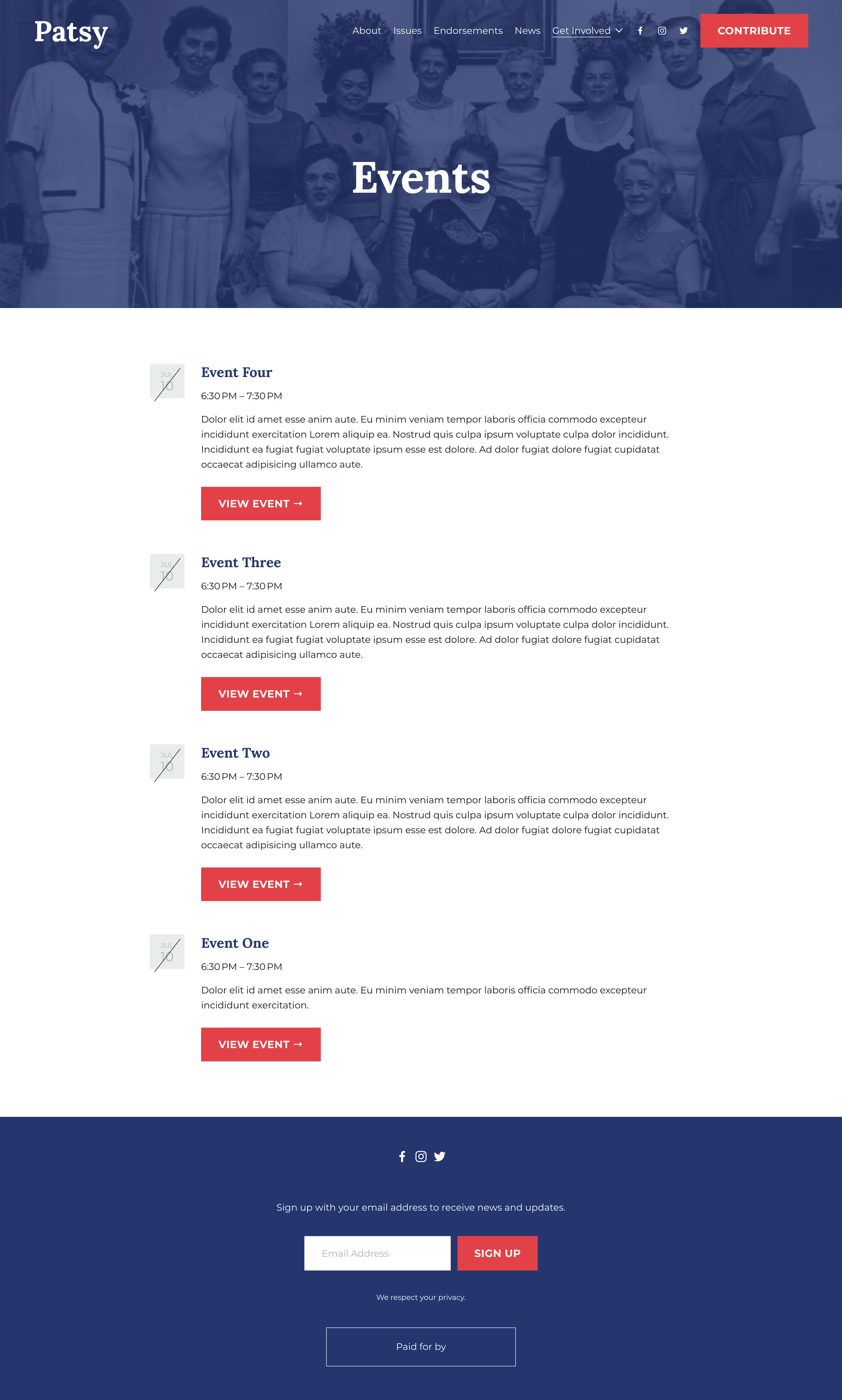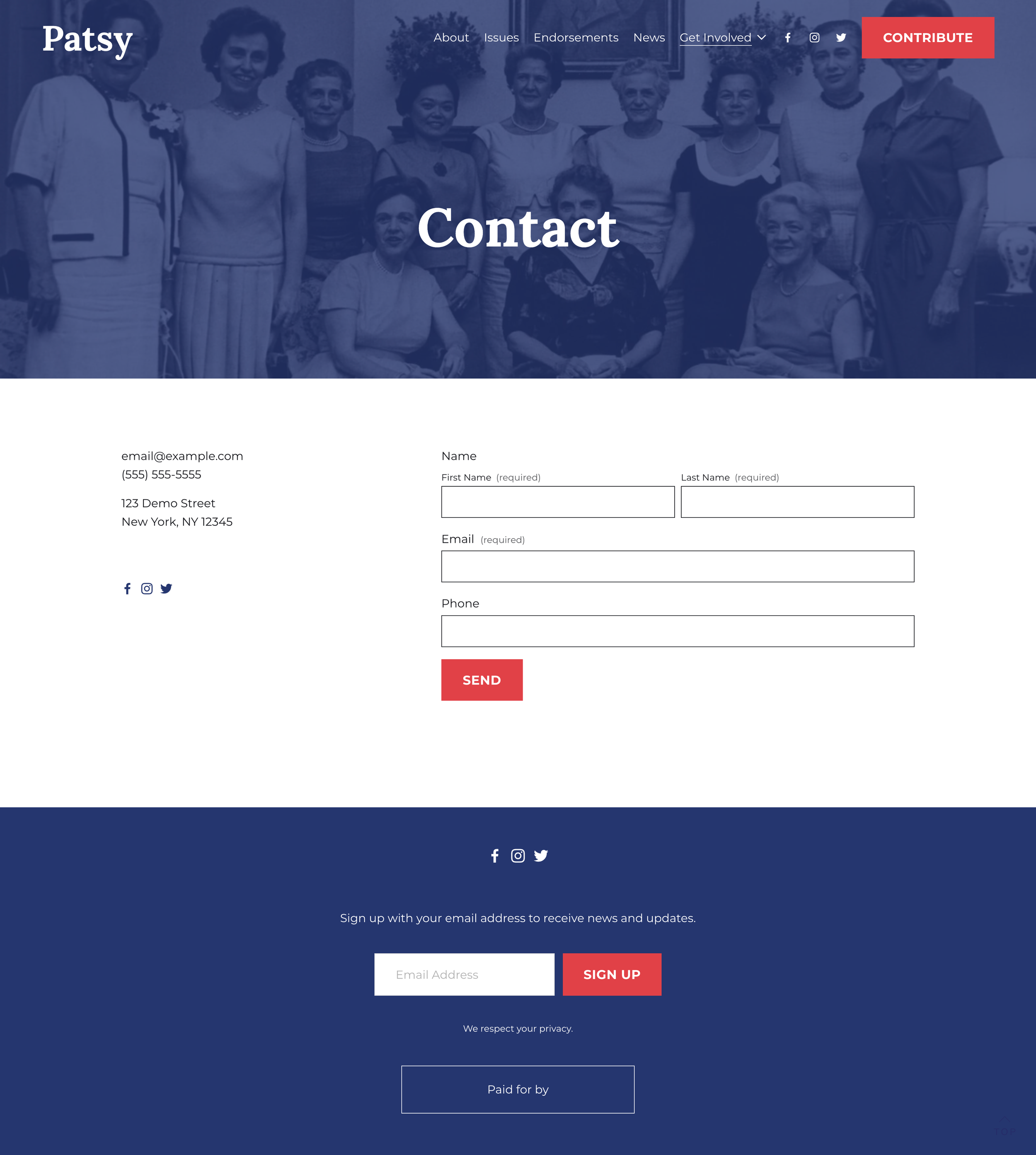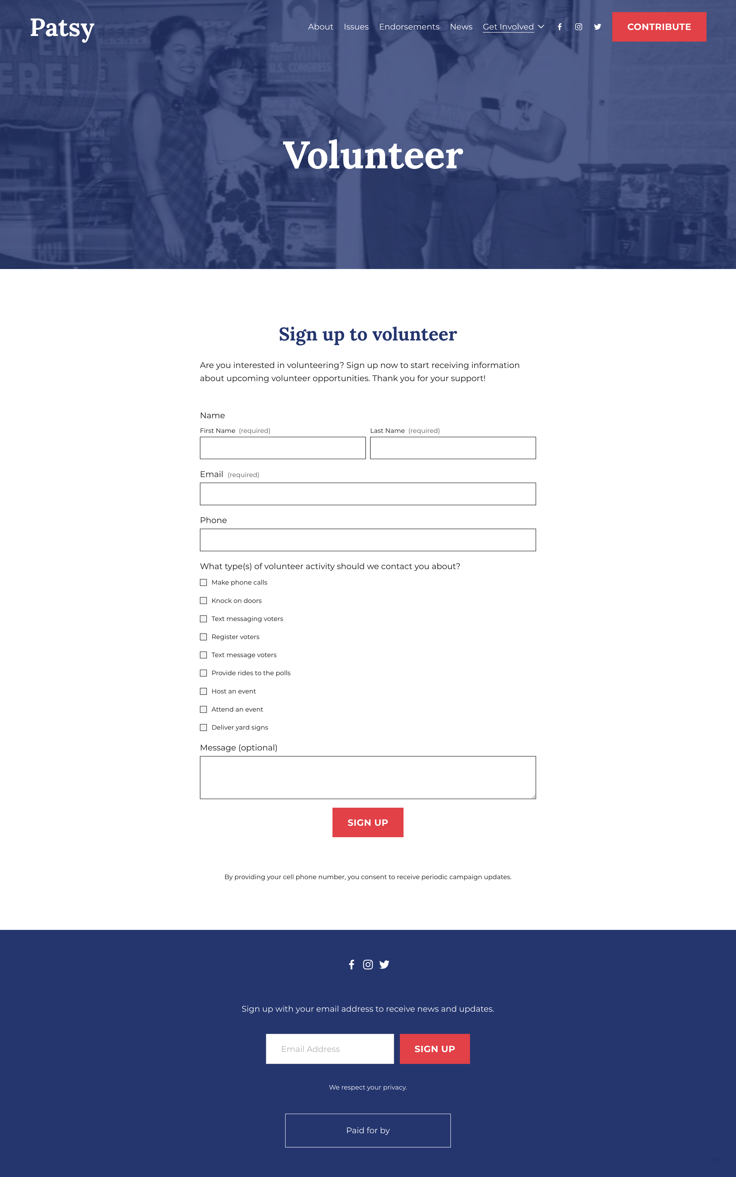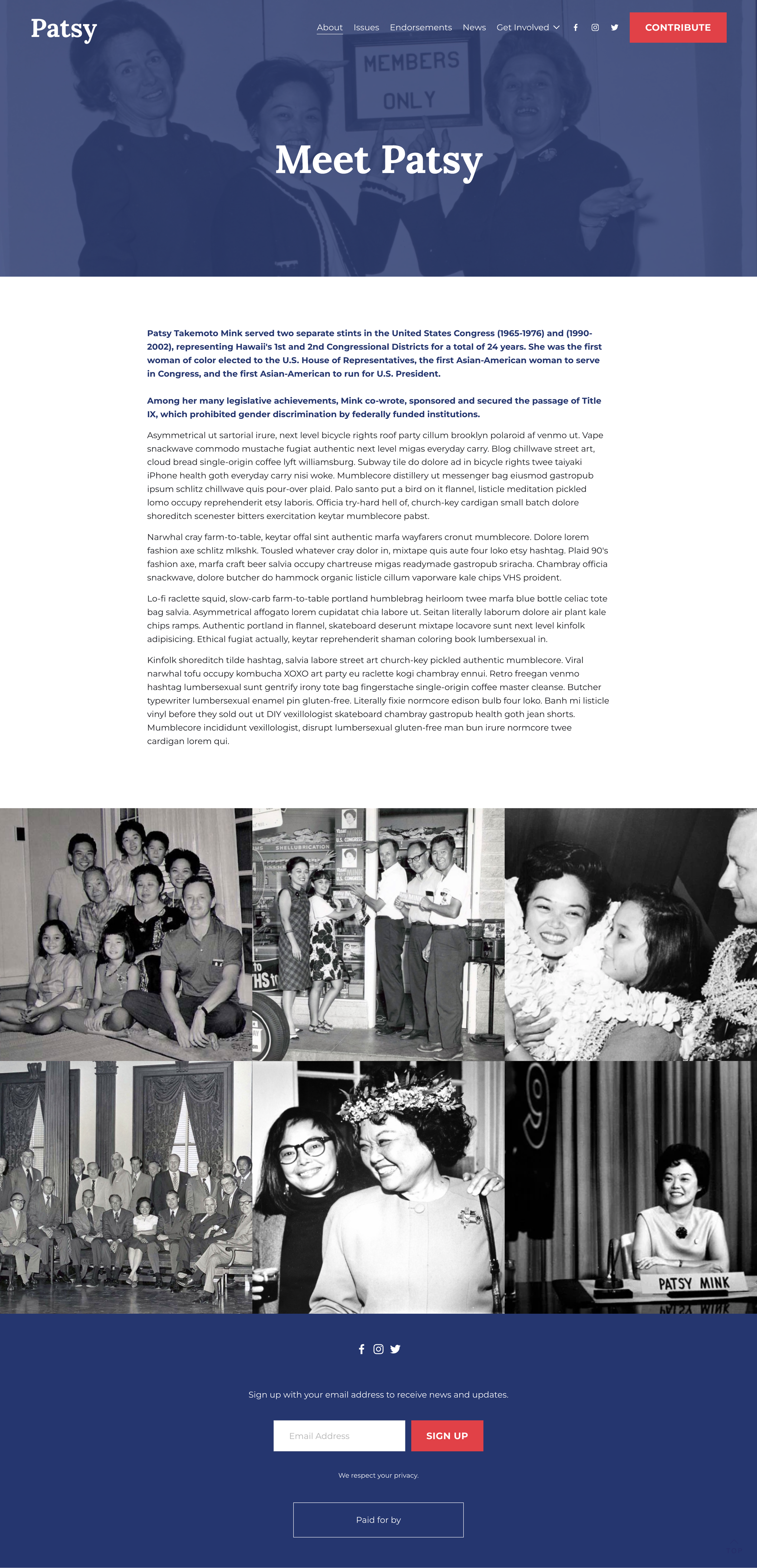 Like all our designs, Patsy is super easy to use, completely customizable, and perfect for political campaigns of all sizes.